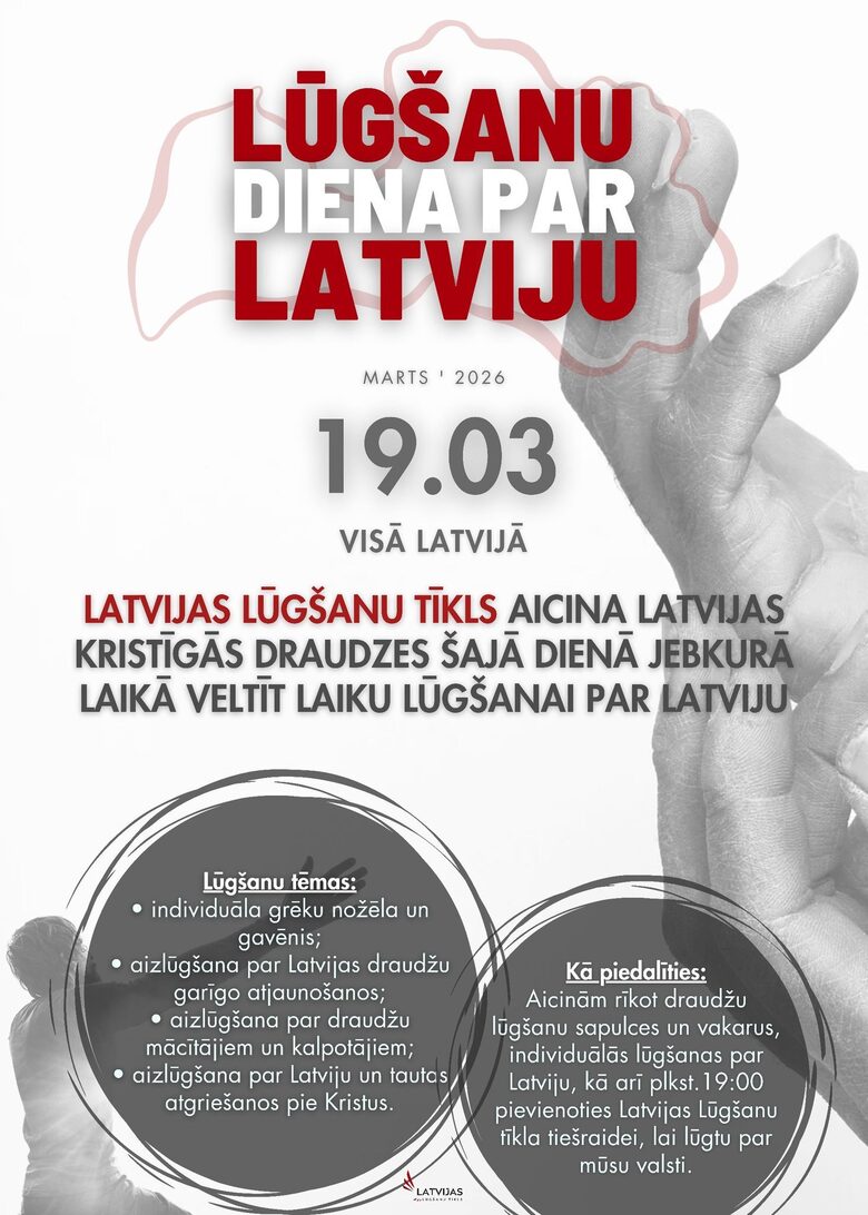 Latviju - 19.martā (visā Latvijā), lai vienotā lūgšanā lūgtu par mūsu